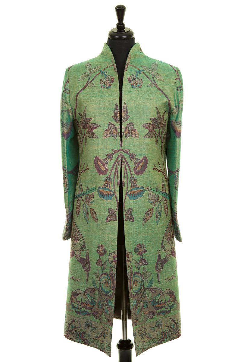 Our elegant Lyra Coat is the perfect style for simple understated elegance. It's what Shibumi is all about. This stylish women’s frock coat can be worn for a wedding outfit, a coat for the opera, worn dressed up for the races or even casually with a pair of jeans. The curved neckline is beautifully cut and the A-Line shape of this dress coat is very flattering. Available in all of our cashmere, plain raw silk and embroidered silk fabrics. UK sizes 6-26.