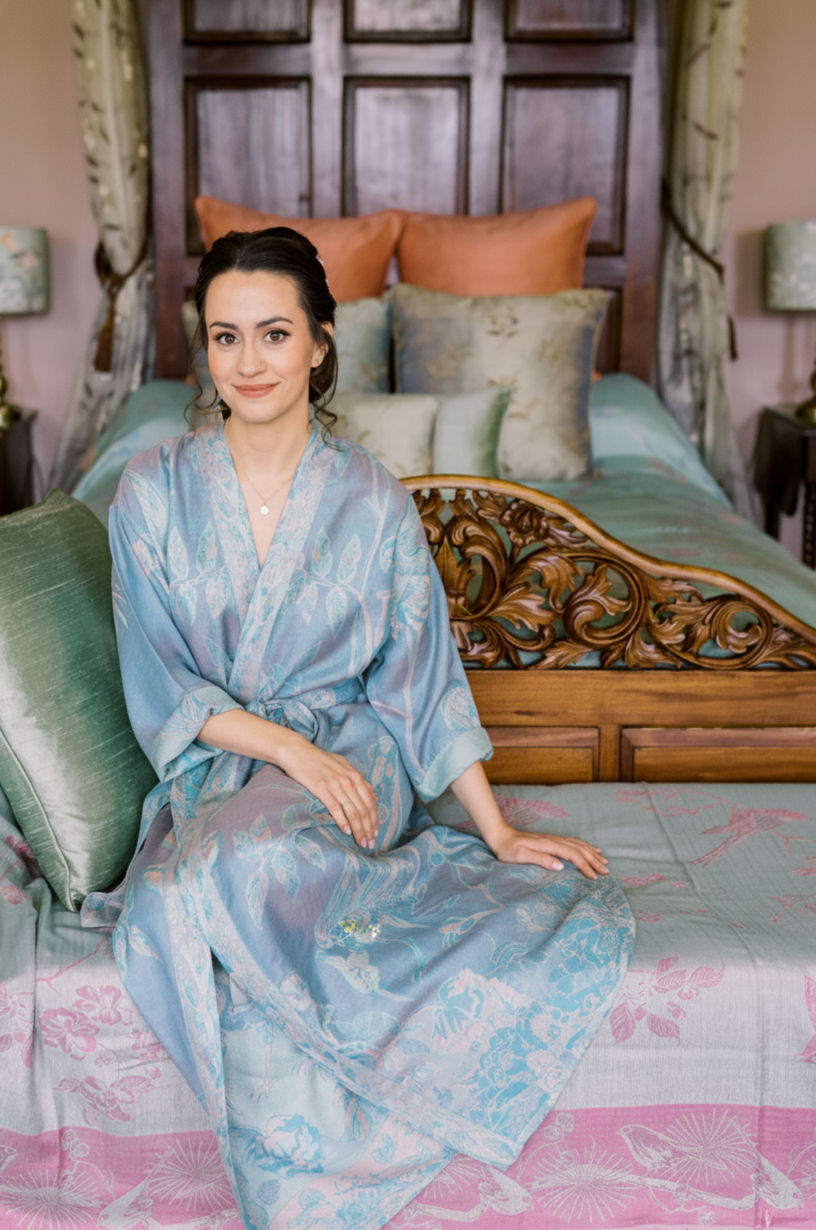 This pale turquoise cashmere dressing gown is so luxurious that you’ll never want to take it off! Wear to the beach, over a dress for a party, at the pool, after a bath or spend all weekend at home feeling cosy yet glamourous. These bath robes are fully reversible due to the clever French seams, and the reverse of this gown is Eau de Nil.