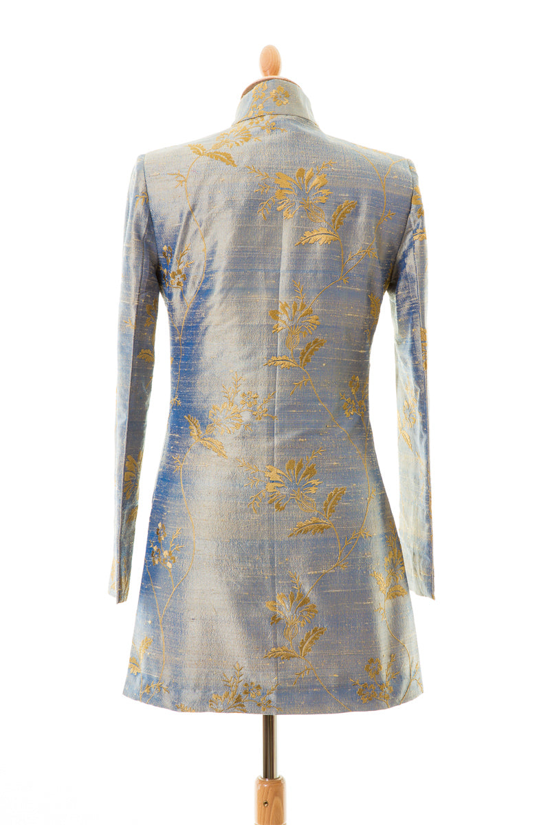 A blue and gold ladies longline jacket with a classic Nehru style collar in embroidered silk. A very popular jacket which is designed to be worn open and looks best when worn with trousers, a great length if you like to have your bottom covered! Simple and stylish, with no pockets and small vents at the sides. Wear this women’s mid length jacket to the races, opera, a wedding, a party or out for lunch. Wherever you wear it you will feel incredible!