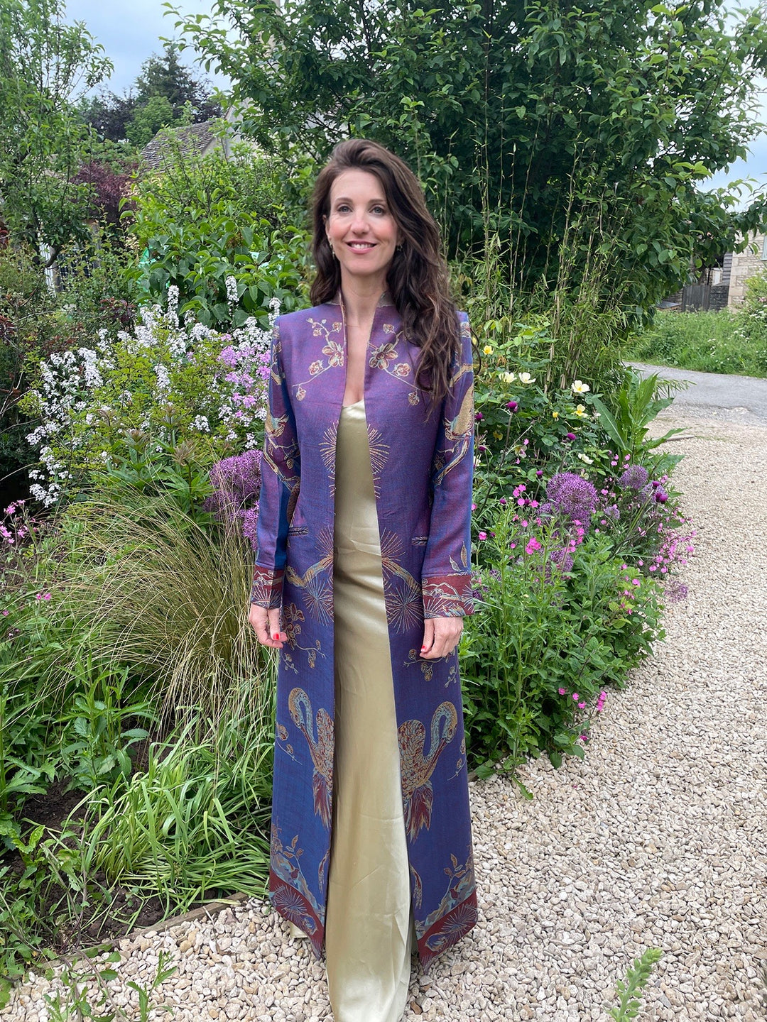 The Devi is a statement coat. A floor-length maxi coat; it is a fabulous frock coat style for the Mother of the Bride, but is most popular with our Brides for the perfect show-stopping bridal coat to wear over a wedding dress. The elegant cut is flattering with a subtle half belt detail at the back to accentuate the waist, and looks best when worn open. ‘Devi’ means Goddess in Sanskrit, and you will be sure to feel like one in this coat! Available in all of our cashmere, plain raw silk and embroidered silk fabrics. UK sizes 6-26.