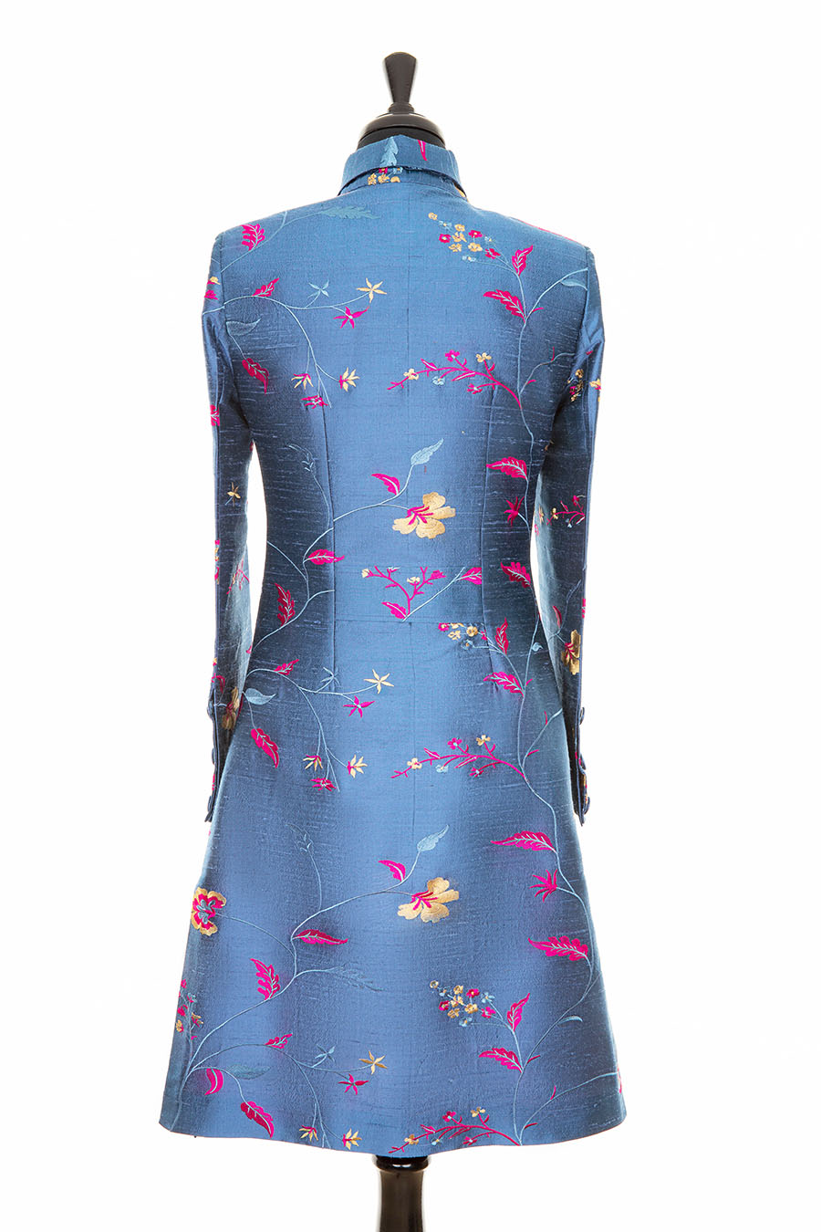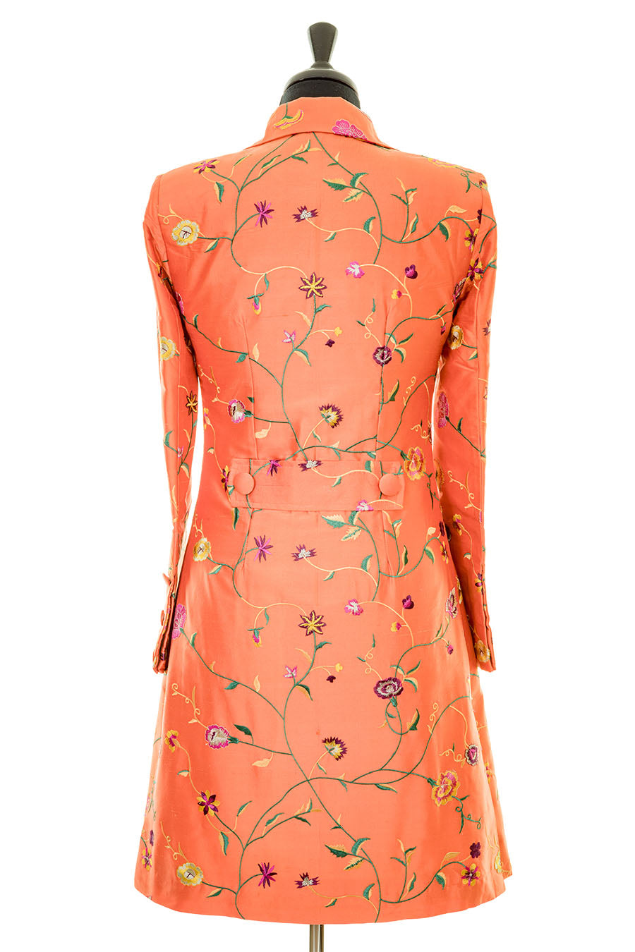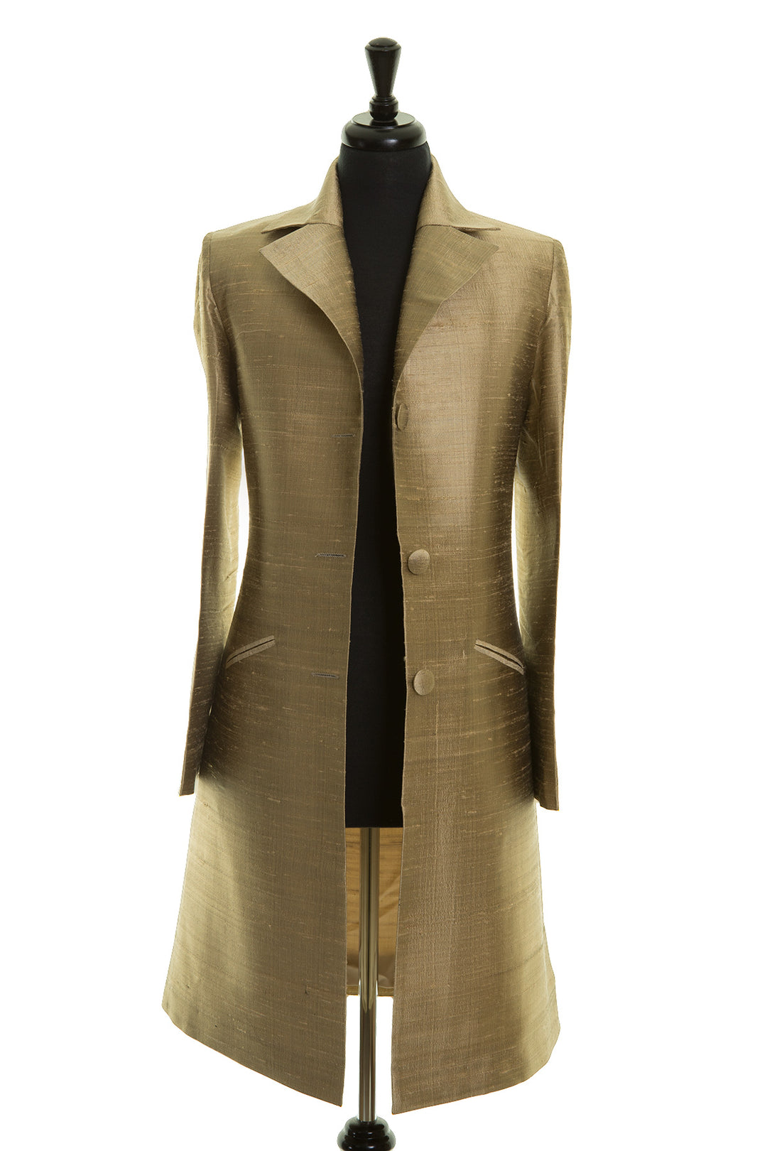 The Grace Coat is our most popular knee length single-breasted women’s cashmere or silk coat. It can be worn smart or casual depending on what's worn with it. It is one of our best-selling coats and is so useful due to its versatility, wear it to a wedding over a dress one day, and the next day with jeans out for lunch. This coat is designed to be worn open, with vents at the sides and a half belt at the back to provide a flattering fit. Available in all of our cashmere, plain raw silk and embroidered silk fabrics. UK sizes 6-26.