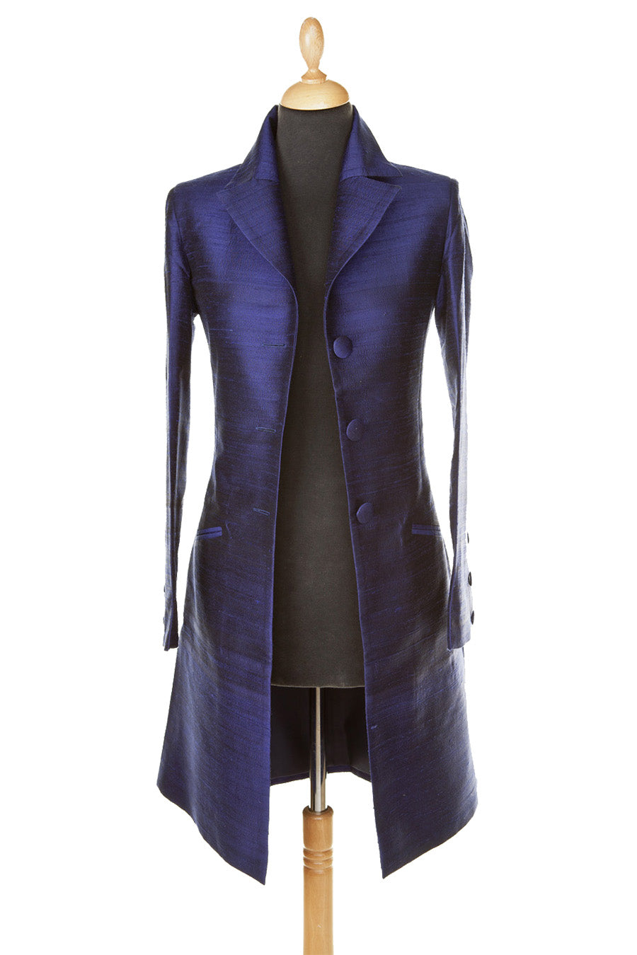 Our most popular knee length, single breasted raw silk coat, best worn open, with a half belt at the back for a flattering fit, a revere collar and vents at the sides. This navy blue coat can be worn smart or casually; for a wedding guest outfit, the theatre or a day out with friends. Looks just as good over one of our silk dresses as it does with jeans.