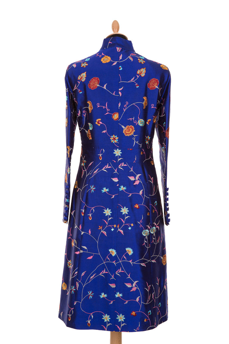 The Avani Coat. This stunning coat is new to the Shibumi silk coat collection. Beautifully tailored with a soft curved collar and 7 small covered buttons on the back of the sleeves. It can be worn open which looks fantastic or it can be fastened with 2 small hooks on the front if needed, which looks very smart. This African Cobalt blue embroidred silk coat is elegant, stylish and beautiful. Perfect for weddings and smart occasions. Length 41.5" / 105.5 cm.