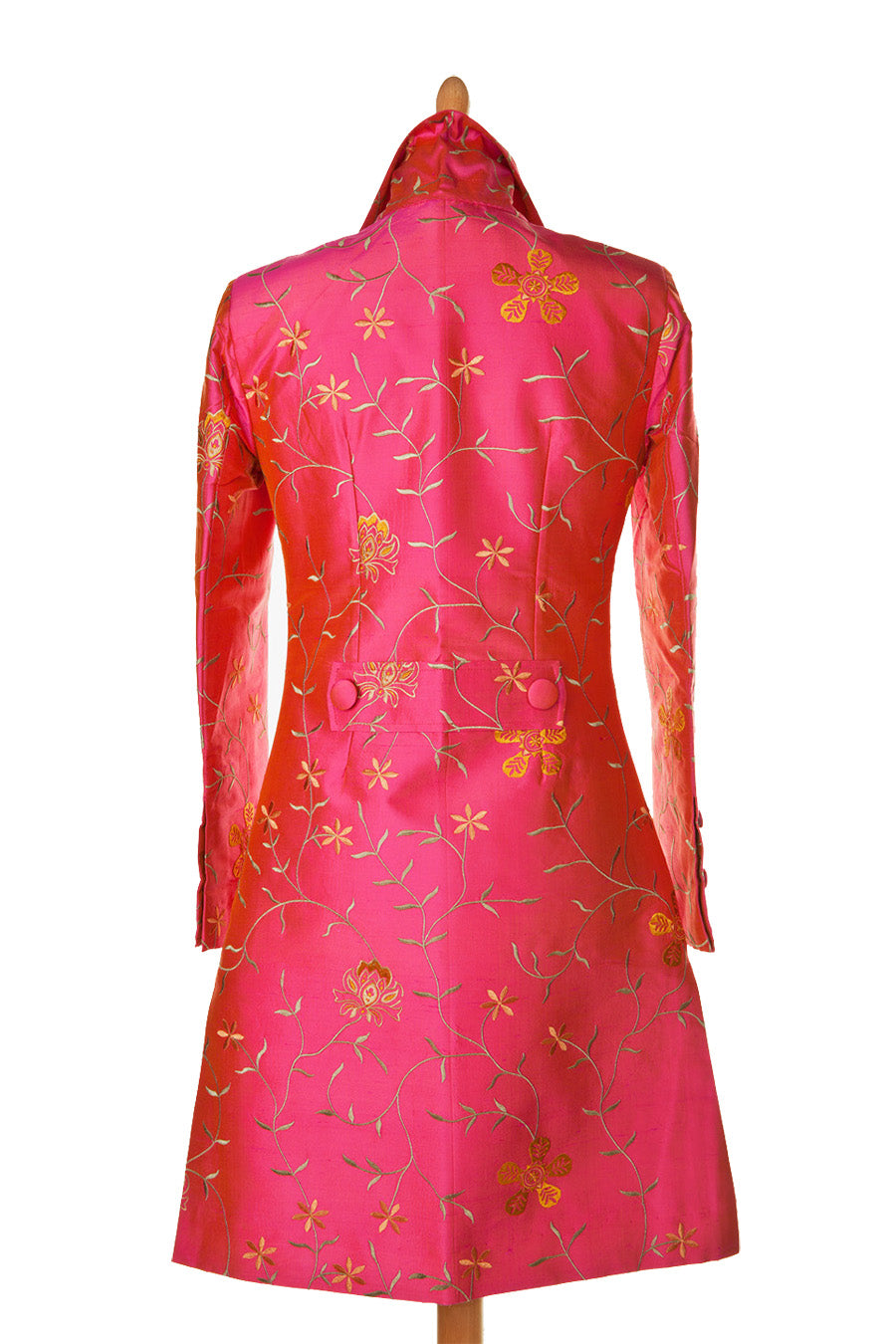 Our most popular knee length, single breasted embroidered silk coat, best worn open, with a half belt at the back for a flattering fit, a revere collar and vents at the sides. This bright pink and orange coat can be worn smart or casually; for a wedding guest outfit, the theatre or a day out with friends. Looks just as good over one of our silk dresses as it does with jeans.