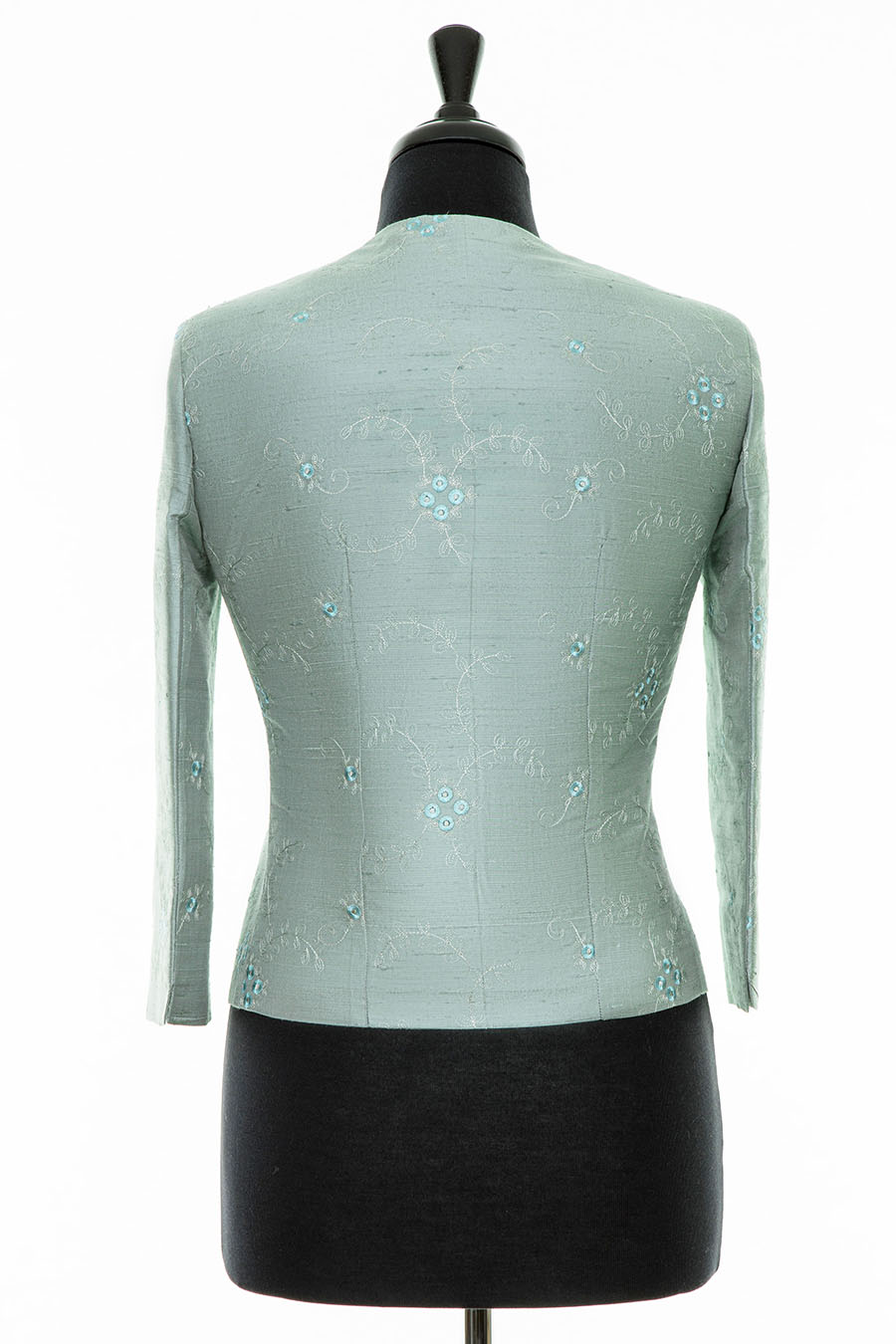 A classic pale grey blue embroidered silk, Chanel style jacket with a box cut. 3/4 length sleeves and a cropped length make this jacket so flattering for any shape.