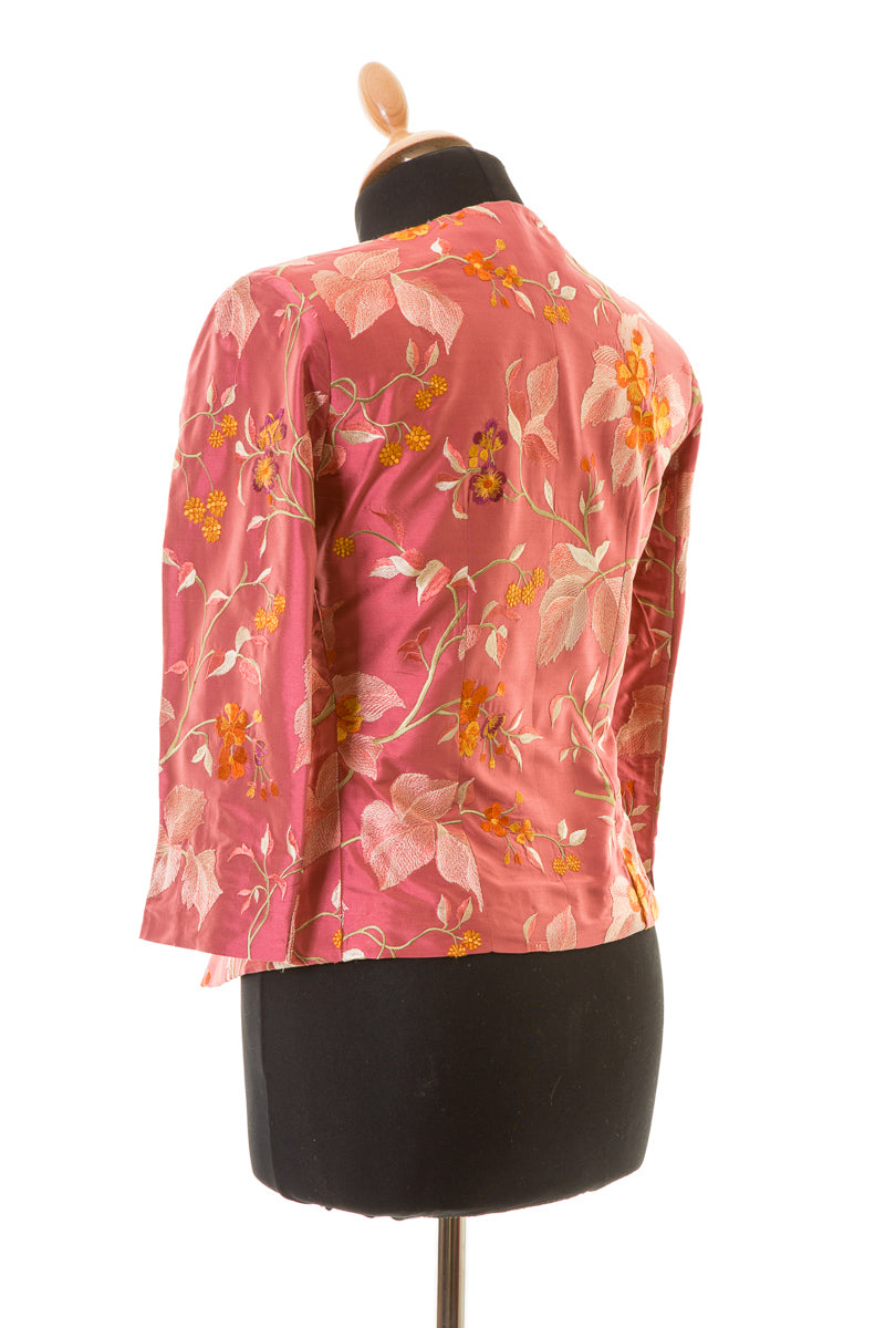 A classic dusty pink embroidered silk, Chanel style jacket with a box cut. 3/4 length sleeves and a cropped length make this jacket so flattering for any shape.