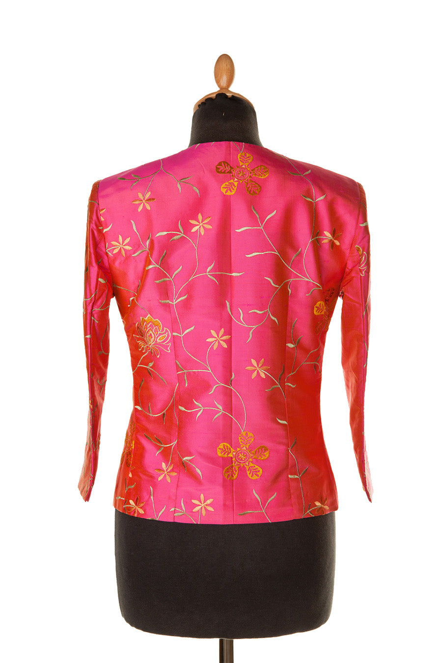 A classic bright pink embroidered silk, Chanel style jacket with a box cut. 3/4 length sleeves and a cropped length make this jacket so flattering for any shape.