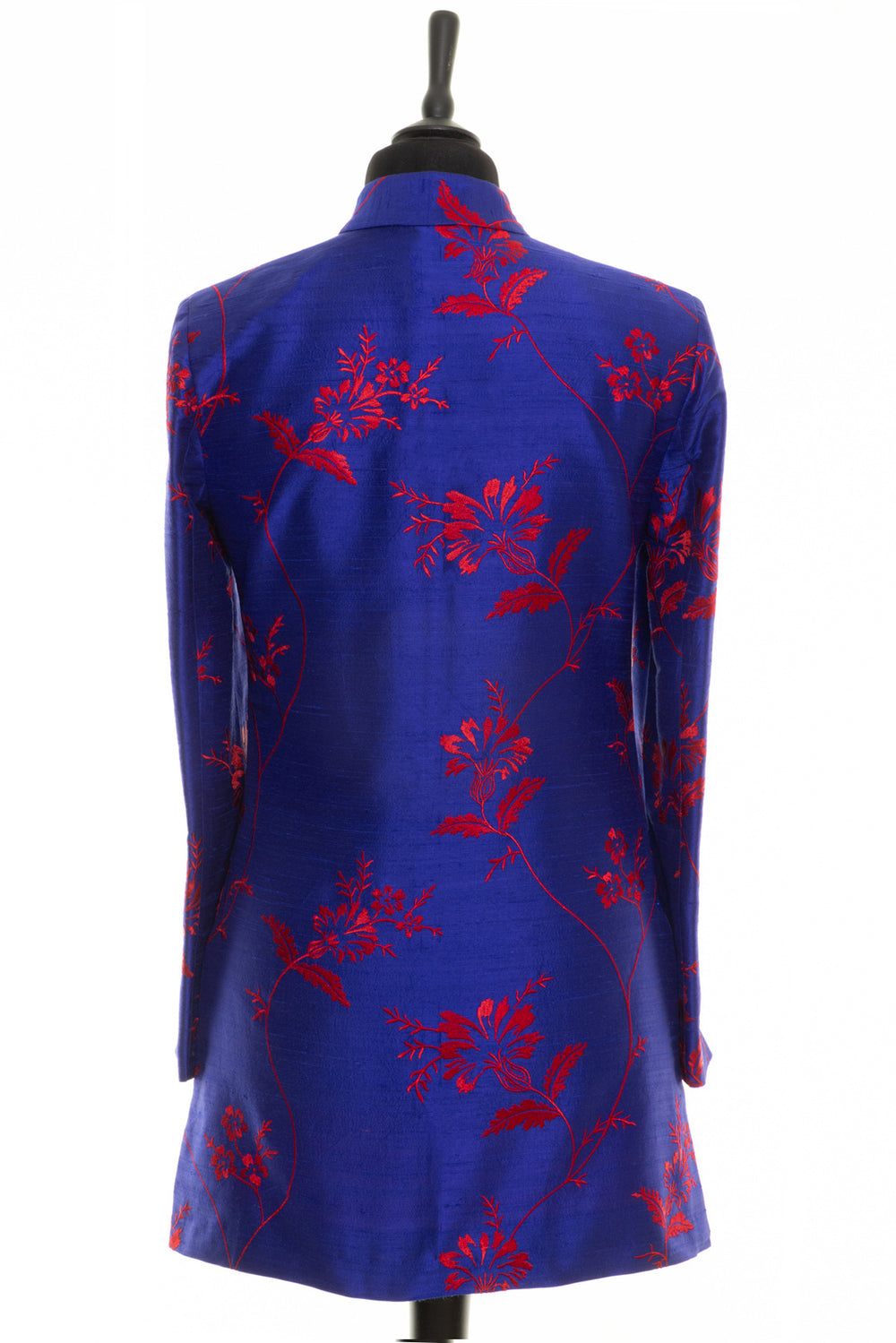 Blue embroidered silk with red floral pattern, this longline jacket has a classic Nehru style collar. A very popular jacket which is designed to be worn open and looks best when worn with trousers, a great length if you like to have your bottom covered! Simple and stylish, with no pockets and small vents at the sides. Wear this women’s mid length jacket to the races, opera, a wedding, a party or out for lunch. Wherever you wear it you will feel incredible!