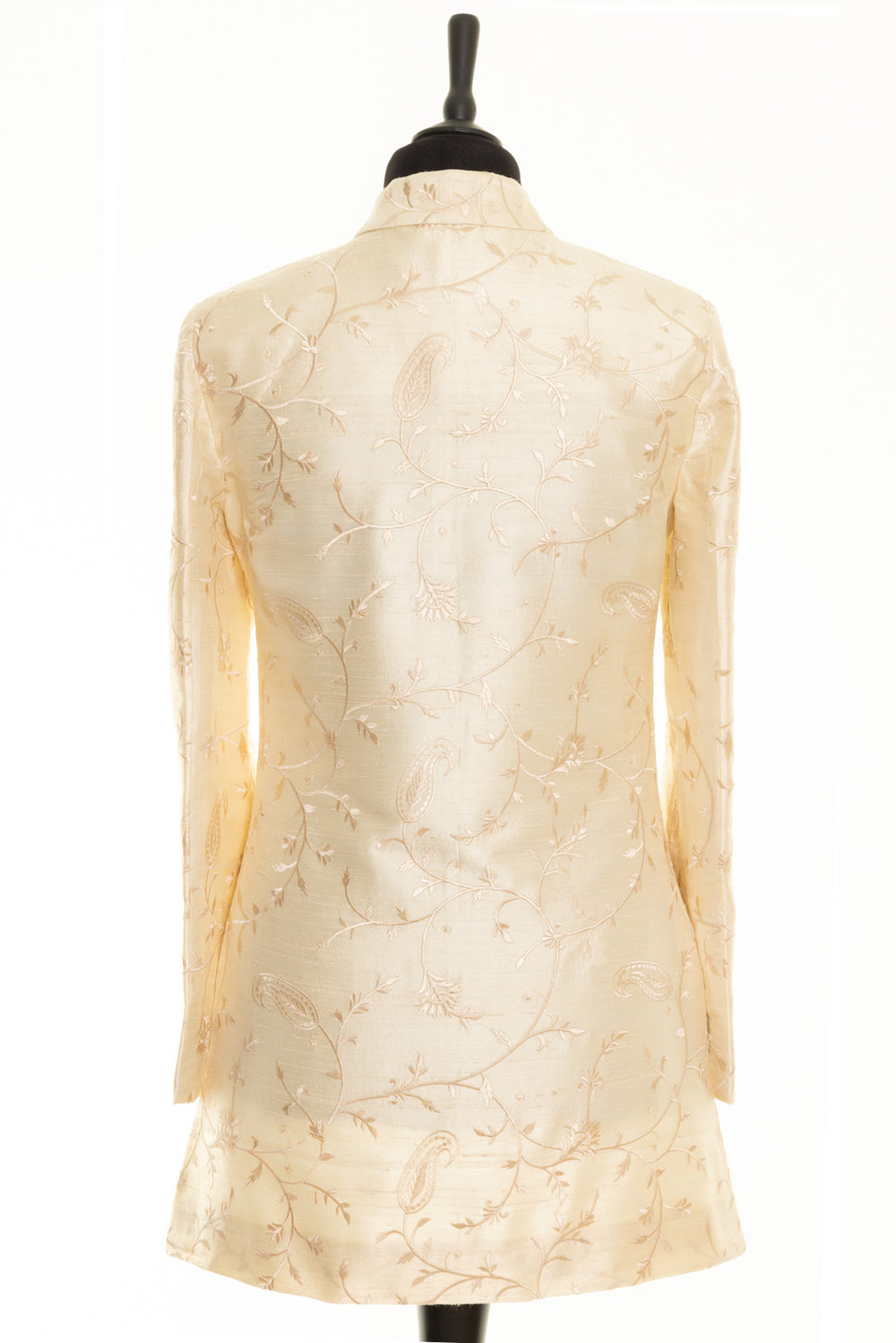 Ivory embroidered silk jacket. This longline jacket has a classic Nehru style collar. A very popular jacket which is designed to be worn open and looks best when worn with trousers, a great length if you like to have your bottom covered! Simple and stylish, with no pockets and small vents at the sides. Wear this women’s mid length jacket to the races, opera, a wedding, a party or out for lunch. Wherever you wear it you will feel incredible!