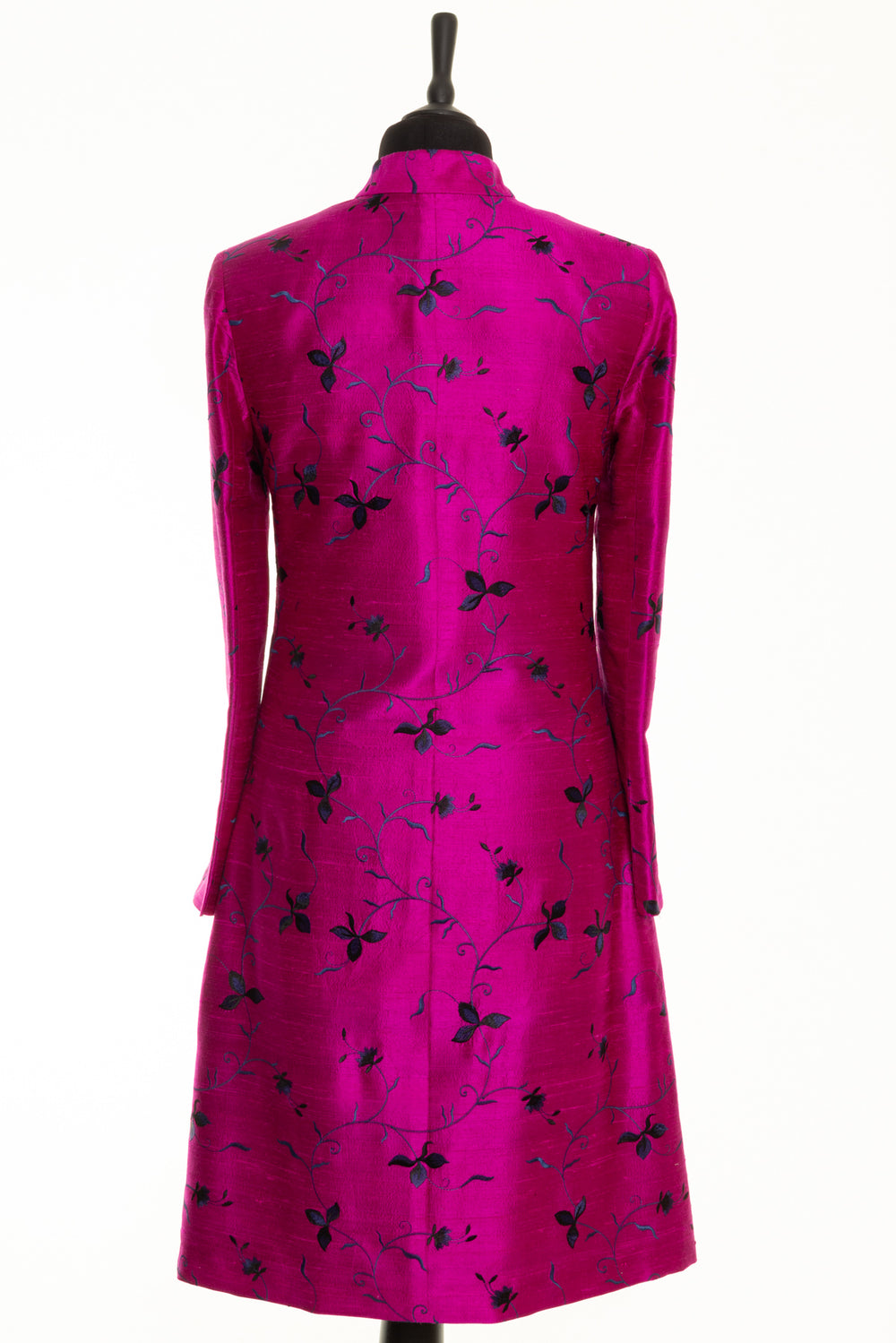 This is a classic women’s Nehru Silk Coat in pink, with floral embroidery, which is our biggest seller as it is such a flattering style for all shapes and sizes. It has a smart mandarin collar, which is so elegant. There are no vents on this women’s wedding coat, it has neat slit pockets and small covered buttons down the front; however, it looks best when worn open, as a frock coat. It looks great worn with dresses, skirts and trousers. A versatile ladies dress coat for smart and casual occasions.