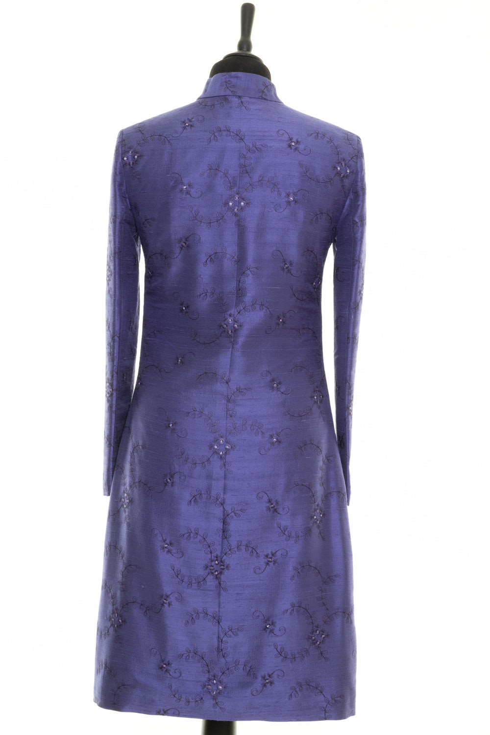 This is a classic women’s Nehru Silk Coat in periwinkle with floral embroidery, which is our biggest seller as it is such a flattering style for all shapes and sizes. It has a smart mandarin collar, which is so elegant. There are no vents on this women’s wedding coat, it has neat slit pockets and small covered buttons down the front; however, it looks best when worn open, as a frock coat. It looks great worn with dresses, skirts and trousers. A versatile ladies dress coat for smart and casual occasions.