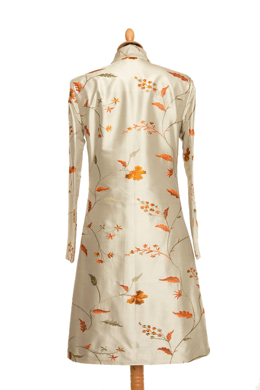 This is a classic women’s Nehru Coat in pale pistachio green embroidered silk, which is our biggest seller as it is such a flattering style for all shapes and sizes. It has a smart mandarin collar, which is so elegant. There are no vents on this women’s wedding coat, it has neat slit pockets and small covered buttons down the front; however, it looks best when worn open, as a frock coat. It looks great worn with dresses, skirts and trousers. A versatile ladies dress coat for smart and casual occasions.