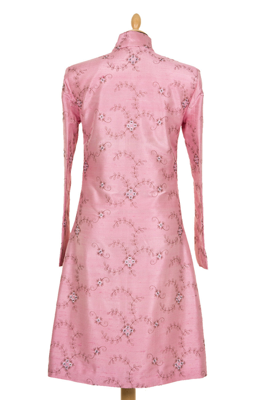 This is a classic women’s Nehru Coat in light pink embroidered silk, which is our biggest seller as it is such a flattering style for all shapes and sizes. It has a smart mandarin collar, which is so elegant. There are no vents on this women’s wedding coat, it has neat slit pockets and small covered buttons down the front; however, it looks best when worn open, as a frock coat. It looks great worn with dresses, skirts and trousers. A versatile ladies dress coat for smart and casual occasions.