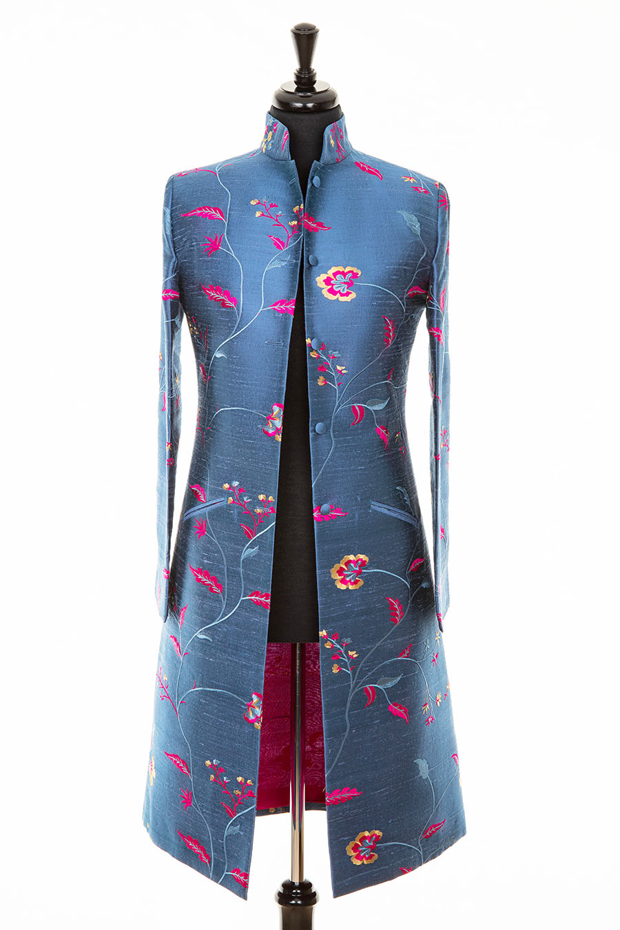 This is a classic women’s Nehru Coat in blue and pink embroidered silk, which is our biggest seller as it is such a flattering style for all shapes and sizes. It has a smart mandarin collar, which is so elegant. There are no vents on this women’s wedding coat, it has neat slit pockets and small covered buttons down the front; however, it looks best when worn open, as a frock coat. It looks great worn with dresses, skirts and trousers. A versatile ladies dress coat for smart and casual occasions.