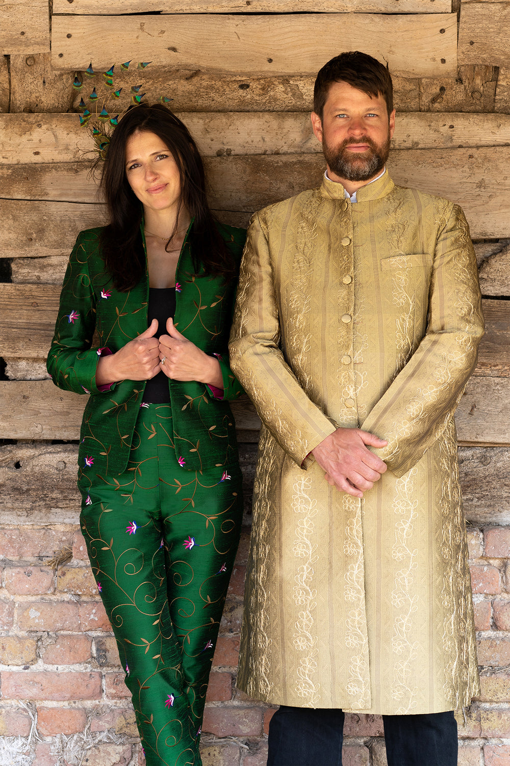 A very stylish, single breasted dark gold embroidered silk frock coat with a classic mandarin collar. This men’s Nehru collar silk coat comes below the knee and has neat, slanted slit pockets and a top pocket on left side. Fully lined with inside pockets and a secret pocket.