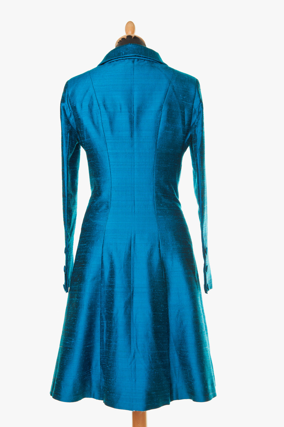 Our Wedding Coat. This bright kingfisher blue silk fitted double breasted, funnel neck coat is simply stunning. This silk dress coat is versatile and super smart with silk covered buttons and neat slit pockets. This coat is perfect for Mother of the Bride, to attend the races or Opera…a really smart evening coat which is so easy to wear.